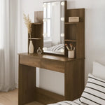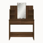 Coiffeuse Léane en bois foncé avec miroir lumineux à ampoules LED et étagères latérales, meuble moderne et fonctionnel pour chambre élégante.